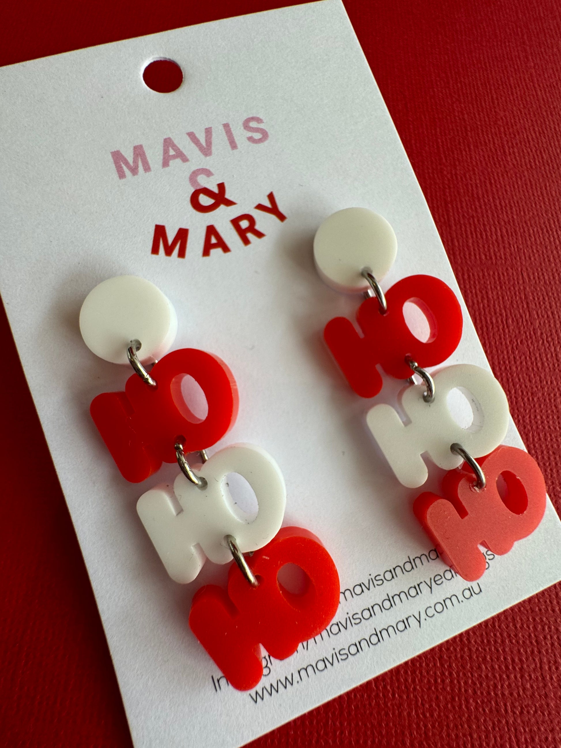 Jump into the holiday spirit with these playful red and white matte 'HO HO HO' earrings. Perfect for all those holiday parties.