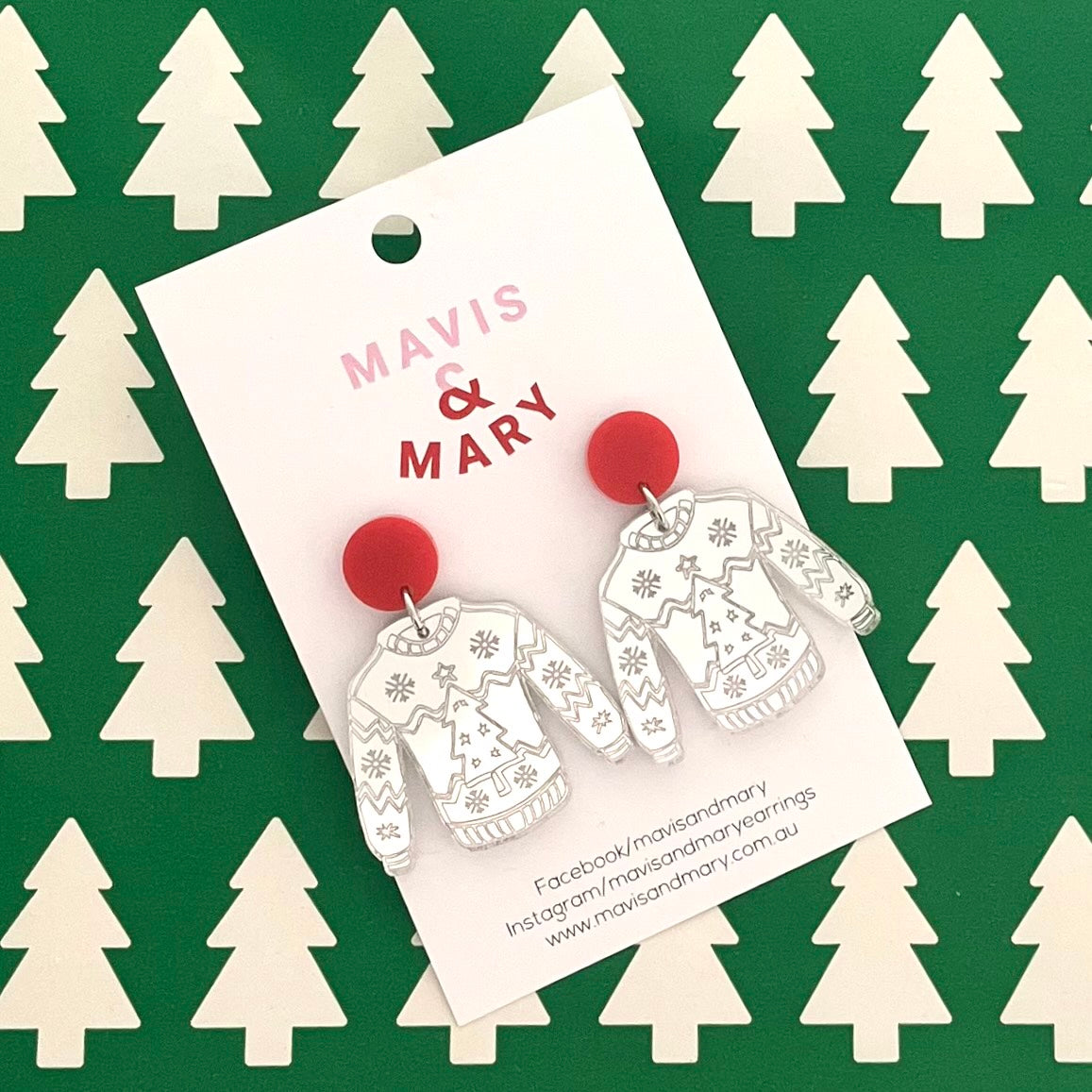 Show off your holiday spirit with these quirky ugly jumper Christmas earrings, a little bit of fun the silly season. A matte red top, with a silver mirror etched ugly jumper.
